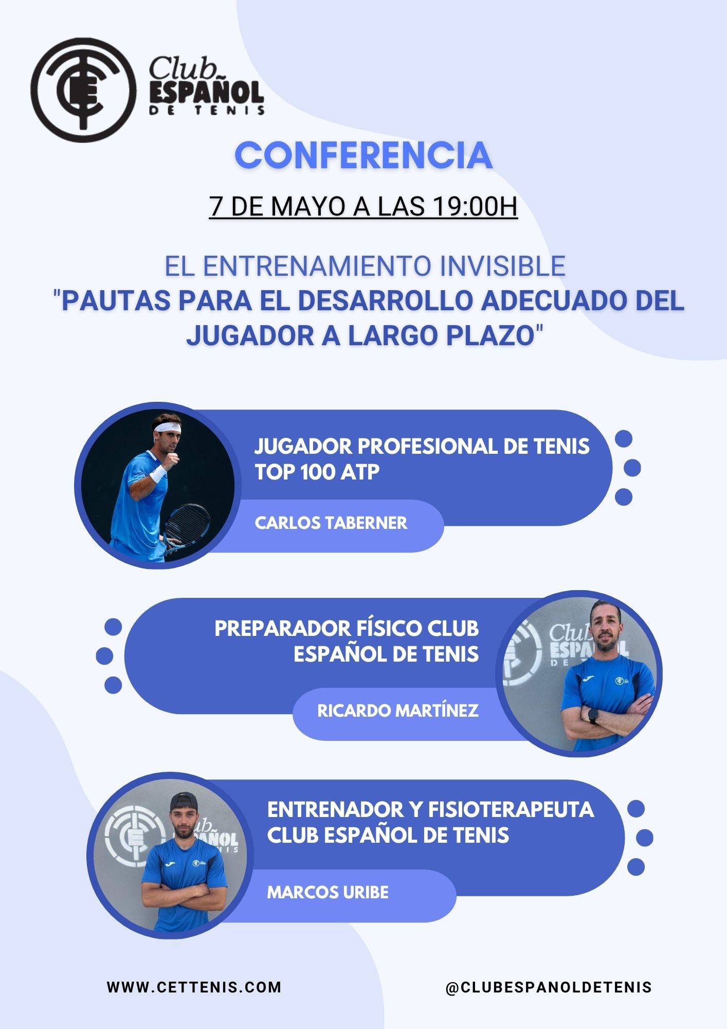 El próximo jueves 7 de mayo, a partir de las 19 horas, en nuestro Club Español de Tenis tendremos una interesante charla titulada: “El entrenamiento invisible: Pautas para el desarrollo adecuado del jugador a largo plazo”.