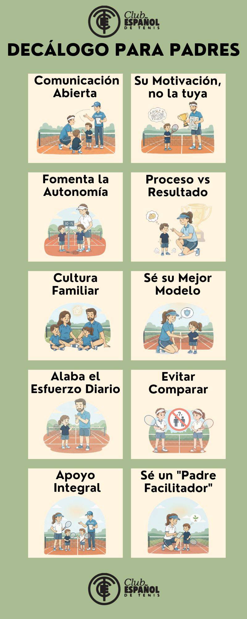 Como complemento a esta charla, se ha elaborado un pequeño decálogo para padres, con el objetivo de ofrecer pautas sencillas que ayuden a las familias a acompañar el desarrollo deportivo y personal de sus hijos de forma saludable, reforzando aspectos como la comunicación, el respeto por los procesos, la autonomía del jugador y el valor del esfuerzo diario.