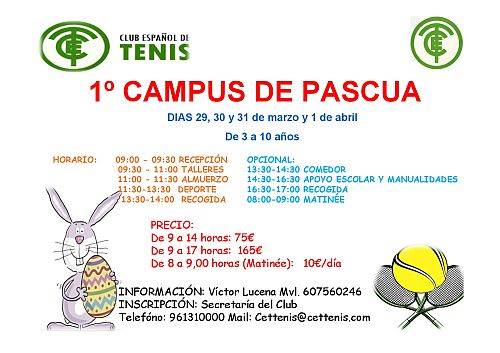 Por otra parte, los días 29, 30, 31 de marzo y el día 1 de abril, se impartirá en el Club  el I Campus de Pascua. En el cartel adjunto podéis ver horarios, actividades, deberes, multideporte, talleres etc. No dudéis en traer a los más pequeños, lo pasaran en grande.