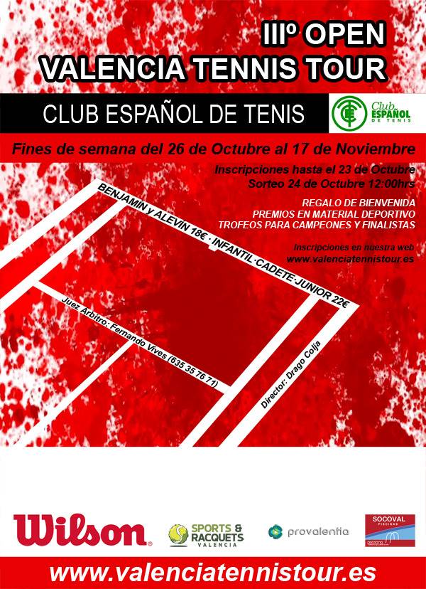 Llega la recta final del Circuito Valencia Tenis Tour 2019 y lo hace en nuestro Club Español de Tenis. A partir del 26 de octubre y en fines de semana acogeremos el III Open del Valencia Tenis Tour, torneo abierto a la participación de cualquier jugador con licencia federativa en vigor en categorías: Benjamín, alevín, infantil, cadete y junior. Las inscripciones ya están abiertas a través de la web oficial del circuito: https://www.valenciatennistour.es/